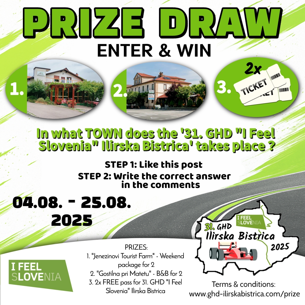 ORGANISER AND PURPOSE OF THE PRIZE DRAW: The organiser of the Prize Draw is Avto klub Olimpija, Celovška 25, 1000 Ljubljana, as the organiser of the 31. GHD “I Feel Slovenia” Ilirska Bistrica 2025. The purpose of the Prize Draw is to promote the Slovenian tourism, as well as the Hill Climb race in Ilirska Bistrica – 31. GHD “I Feel Slovenia” Ilirska Bistrica 2025.